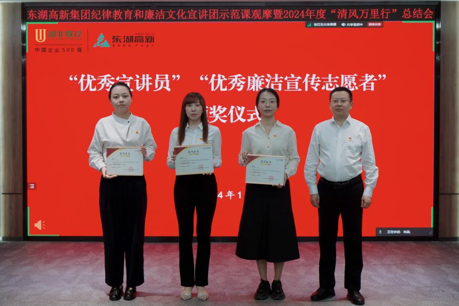 活動伊始,參會人員集中觀看了《清風高新廉行萬里——東湖高新集團2024年“清風萬里行”系列宣教活動巡禮》專題視頻,共同對今年宣教活動進行了回顧。隨后,組織大家觀看了兩則優(yōu)秀廉潔公益廣告視頻,學習其中“以物喻廉”的廉潔文化宣傳思路。